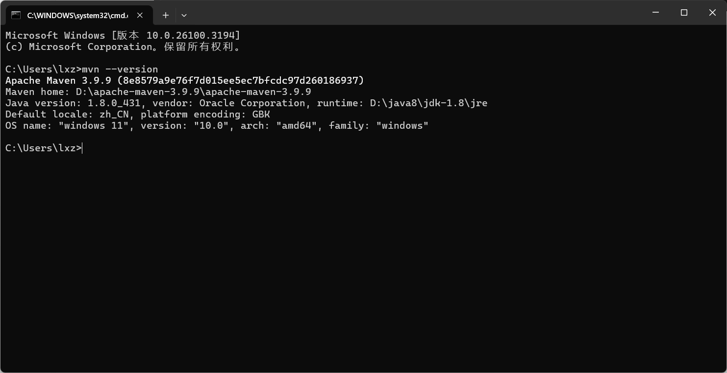 确定即可,然后查看是否配置成功,win+R运行cmd,输入mvn -version,如图所示则配置成功: