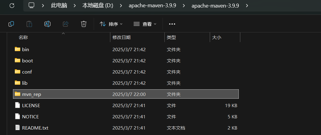 首先在maven目录新建一个mvn_rep作为我们的本地仓库,并复制该目录路径D:\apache-maven-3.9.9\apache-maven-3.9.9\mvn_rep
