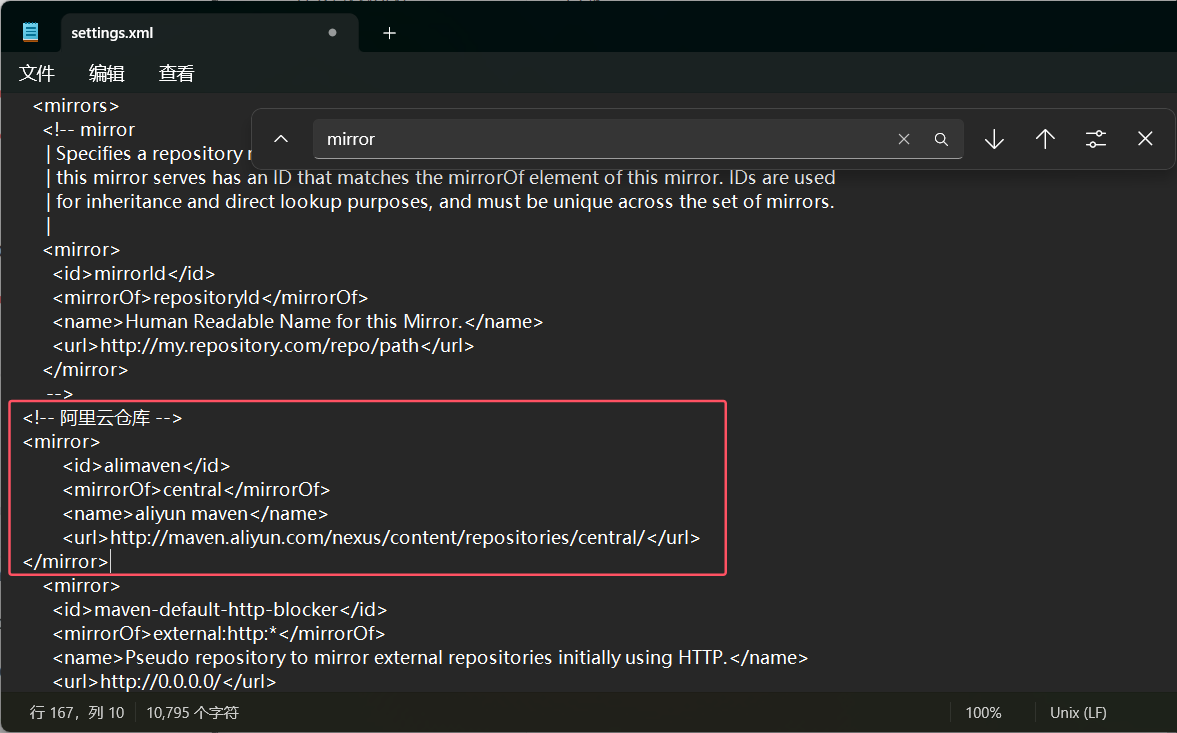 然后我们配置阿里云服务器镜像,修改conf/settings.xml中的标签,为其添加如下子标签,完成后ctrl+s保存退出: