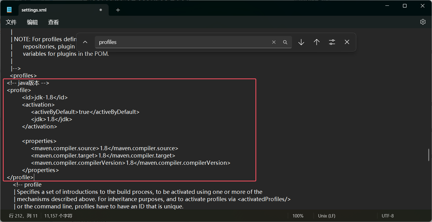 在之前这个 settings.xml 文件中找到 profiles 节点: